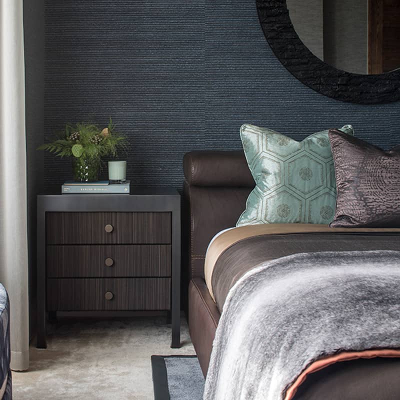 A feature wall of braided hemp grass wallpaper in the guest bedroom of our Broad Walk residential project. Wallpaper from Maya Romanoff.