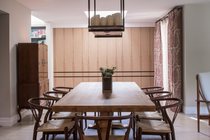 The multi-purpose desk or work area in our Richmond residential project can be discreetly hidden from view by a large sliding timber door that pockets to behind the library shelving, which means there’s no need to keep the work surface clutter-free at all times!