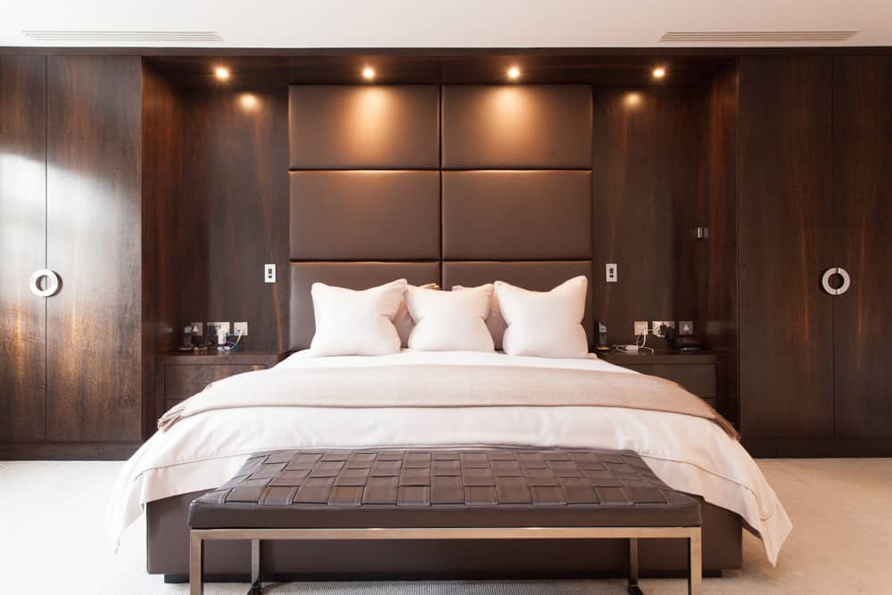 An instant way to integrate the luxe look into a bedroom is to add automated curtains. The comfort and ease of simply pressing a button to open and close shades or blinds adds a sense of opulence. A further touch of the button can activate pelmet lighting to wash a glimmer of light over the curtains when closed. Lighting is essential to create a mood in a space and it’s incredibly rewarding to experiment with light at different levels. Hotels apply this very successfully with their interior architecture – consider constructing ceiling coffers with perimeter lighting when applying this to the bedroom in your home. Take it a step further by cladding the walls including the ceiling in a soft metallic sheen wallpaper, which will emit a warm glow of home lighting to create a beautiful ambience.