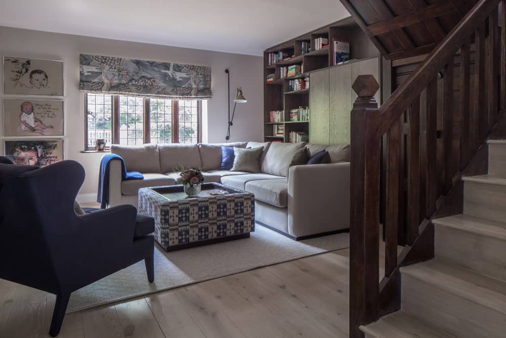 As the nights draw in, we tend to spend more time inside our homes and thoughts naturally turn to cosying up with friends and family to watch TV. The large, L-shaped sofa is the star of the show in this lovely room from our Richmond interior design project – big enough for the whole family to lounge on. Upholstered in a soft wool fabric, the cushions are filled with luxury duck feathers to create the ultimate in softness and comfort.