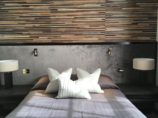 In the bedroom of our St John’s Wood project, we used handcrafted wallpaper as the feature wall behind the bed. This wallcovering uses abaca fibres, which are dried, softened, dyed with natural pigments, and finally either woven or pasted onto the backing. Each production is unique, and one linear meter takes a full work day to produce.
