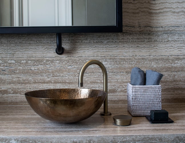 Our personal favourite is to opt for handmade items as any irregularities add individuality and elegance to the piece. In the master bathroom of our Belsize Park project, the hammered antiqued brass basins were handmade in India. A miniature replica was made to admire the hammered technique and a specialist was used to dip the brassware to achieve the desired textures and tones of metals.