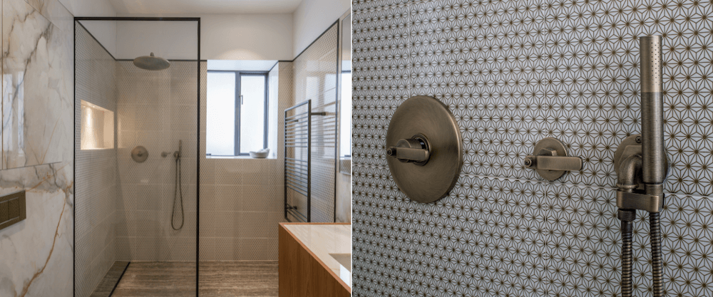 At our Belsize Park duplex project, the owners’ international lifestyle heavily influenced the design. In the guest bathroom, the brief called for a modern industrial aesthetic that reflected their love of natural stone. We paired exquisite Calacatta Gold marble – striking for its warm gold veining with intricately patterned ceramic tiles in the shower area. The result was a refined interpretation of industrial style layered with Asian-inspired motifs that nod to the couple’s travels and affinities.