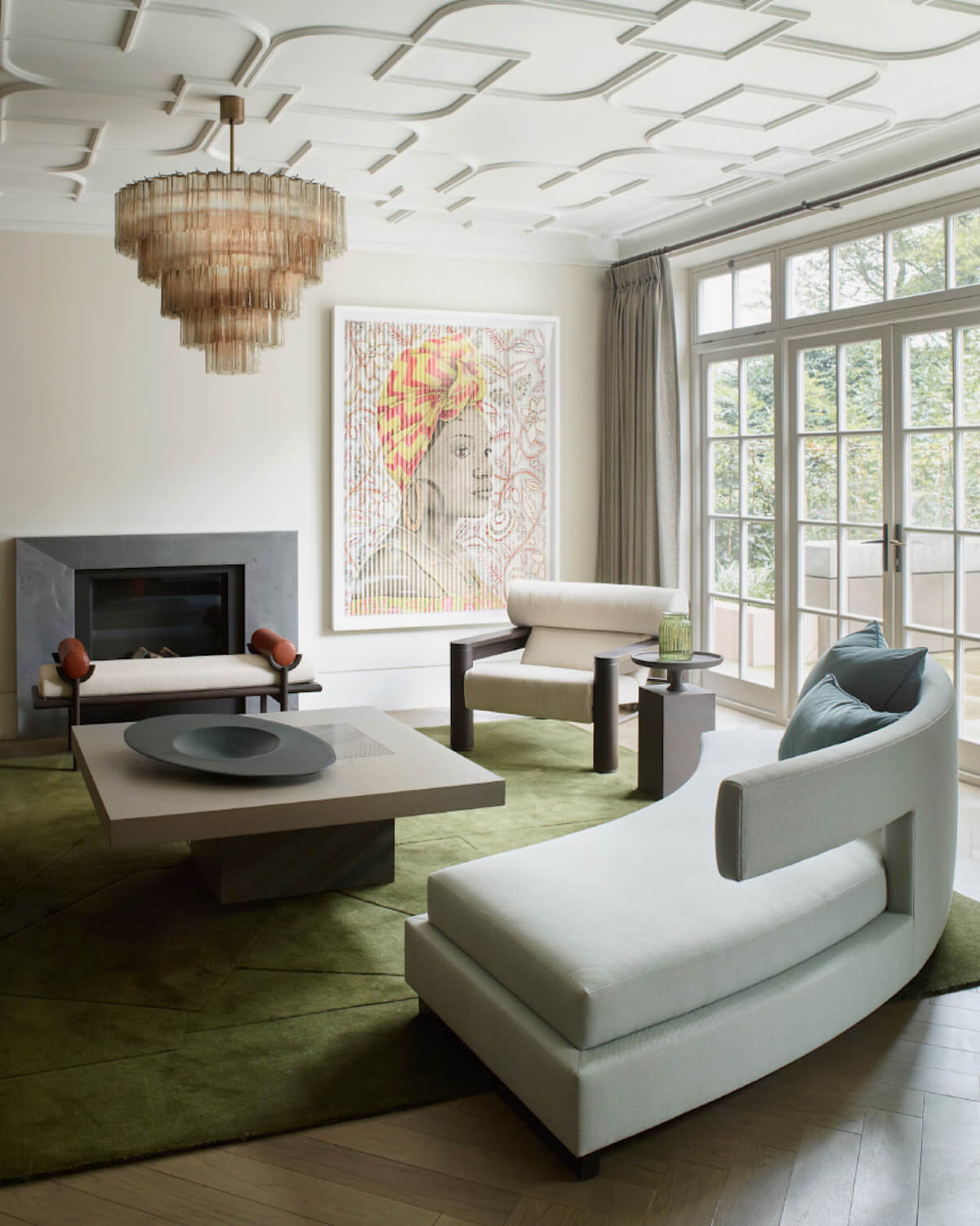 This approach is evident in our recent North London project where our clients’ passion for travel and contemporary art inspired a living room that balances the home’s Arts and Crafts heritage with bold, modern details. From the Art Deco-inspired design of the fireside seat to the reimagined cocktail armchair, every piece contributes to the narrative. Overhead a Bella Figura chandelier in brushed bronze and smoked Murano glass brings modern elegance, while a striking portrait by South African artist Gary Stephens adds a playful, personal edge to the scheme.