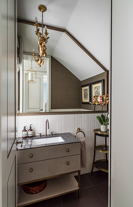 One of the most challenging aspects of this powder room was its unusual shape caused largely by its understairs location. In order to maximise space and reflect as much light as possible, we commissioned a custom-made mirror with an antique brass frame to go above the vanity unit, reaching right up into the highest section of the room.