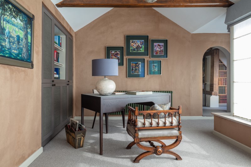 In the sunroom, which the client uses as his study, we played with lots of different textures by using a caramel suede wallpaper, a desk clad in pale blue leather, and shelves with brass stud detailing. The bright green radiator picks up the colour in the artwork.