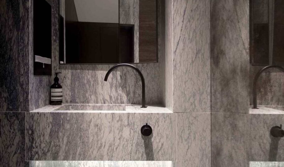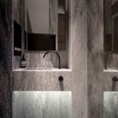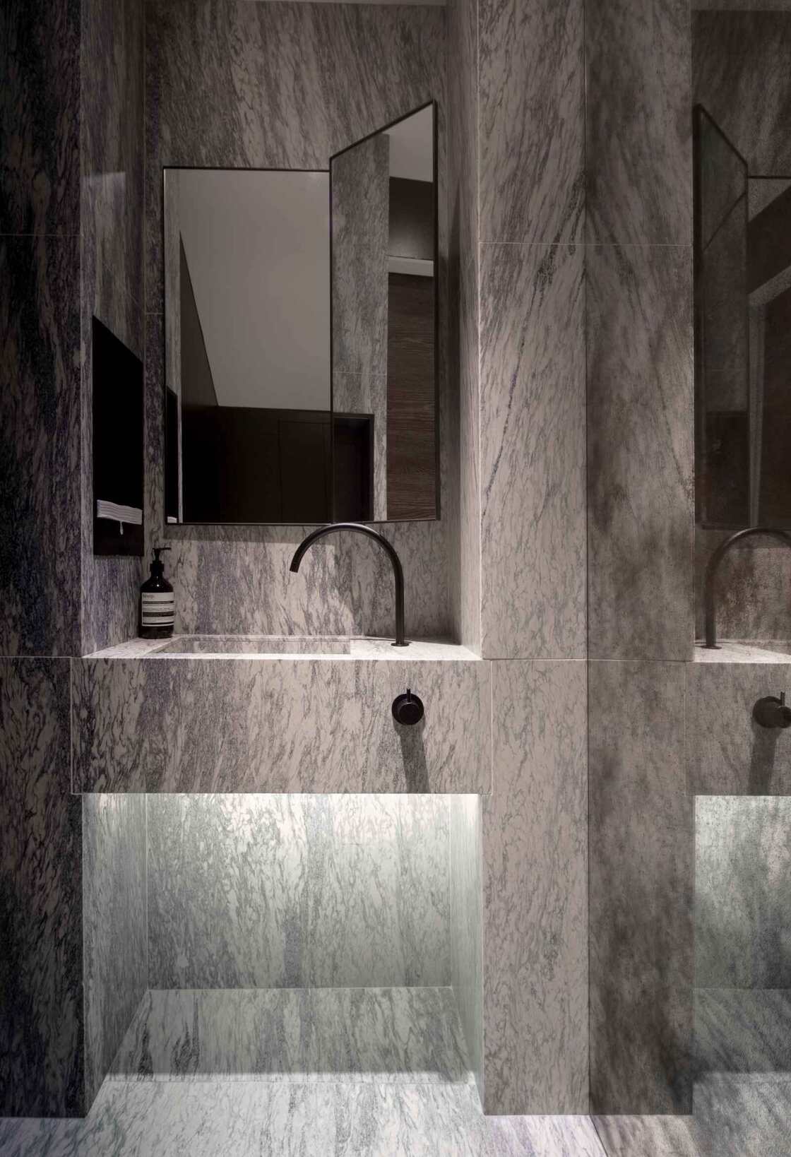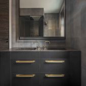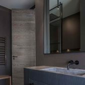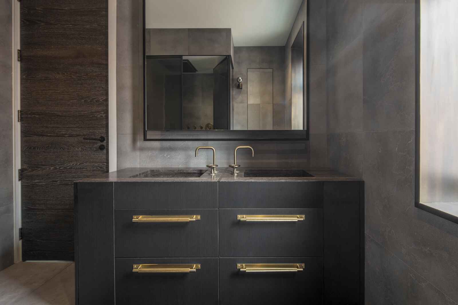 In the master bathroom, the walls are covered in Amaya limestone with a velvet finish and the bespoke vanity in a textured wood with a matt finish. The vanity countertop and bespoke basin feature silver honed travertine. The vanity mirror with steel frame sits in striking architectural proportion to the suspended, tubular light fixtures in brushed brass that complete the contemporary look of this timeless, industrial-luxe bathroom.