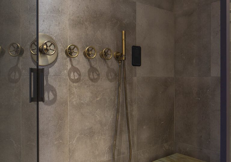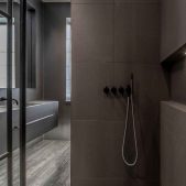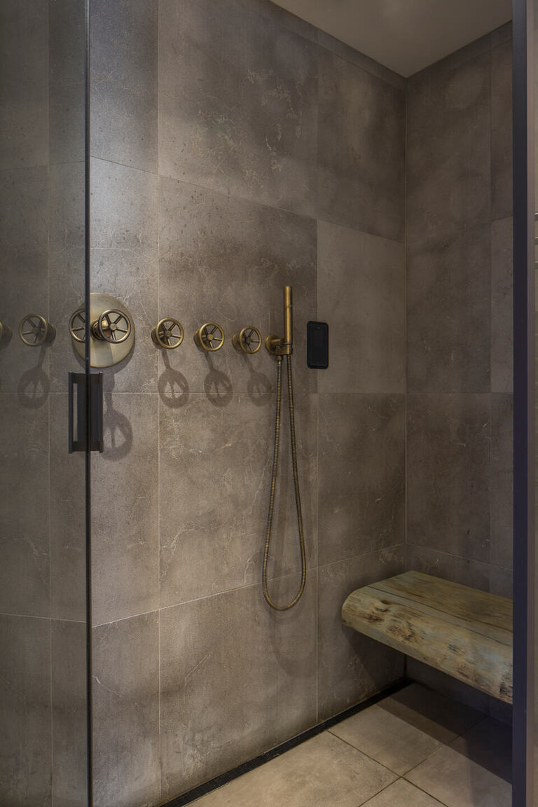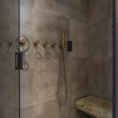 In the shower of this cool, contemporary bathroom, a bespoke waney edged oak bench has been fitted on powder-coated metal brackets and perfectly complements the Brooklyn thermostatic shower set and wall-mounted volume control in aged brass.