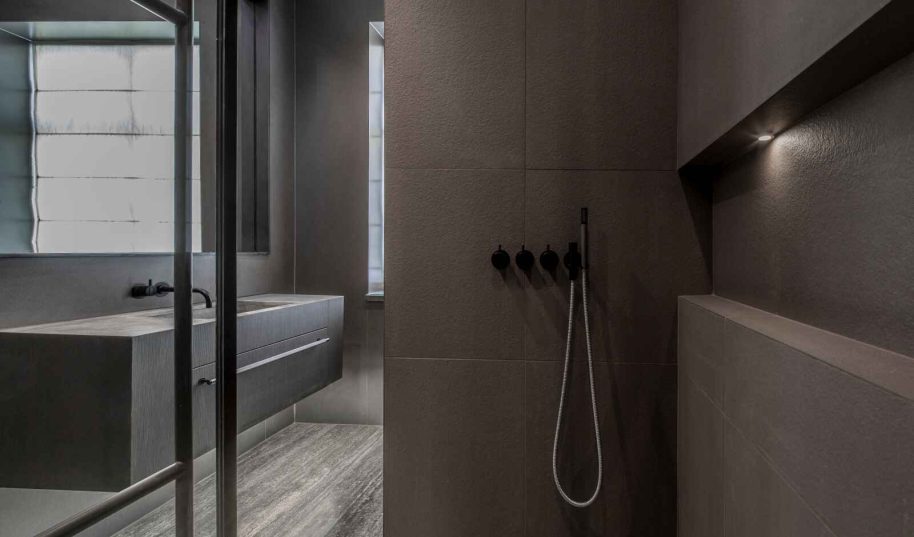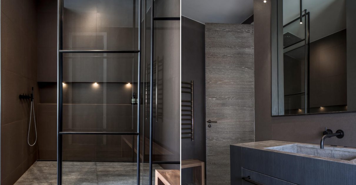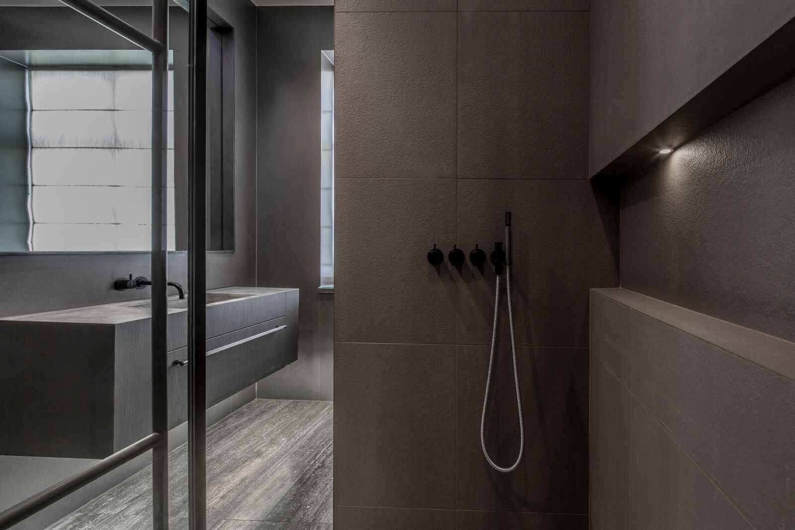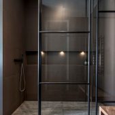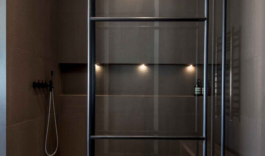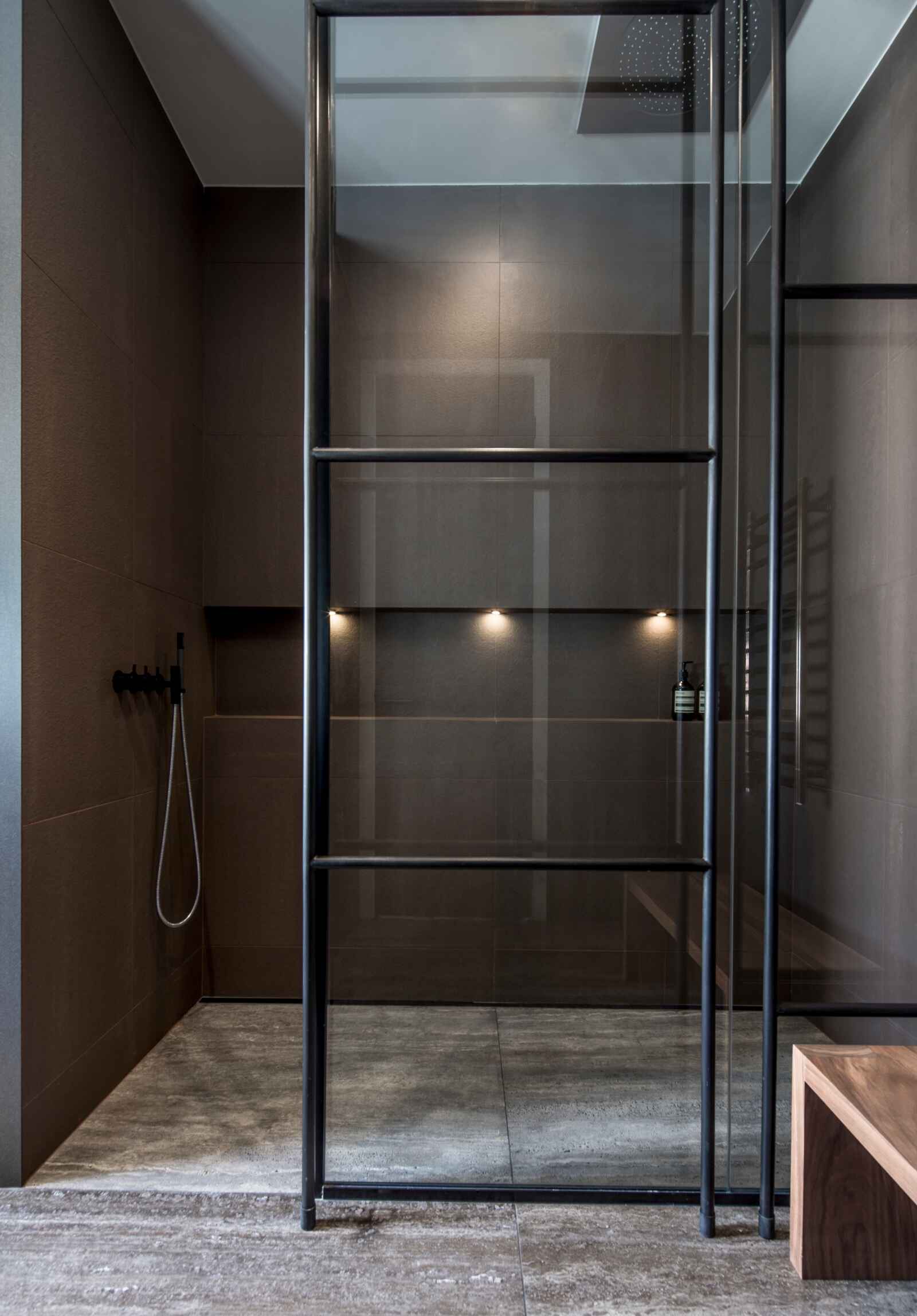 The guest bathroom features silver honed travertine flooring and oak graphite doors with a natural oil wood finish. The tubular light fixtures in matt black complement the pull bar vanity door handles in solid metal and heated towel rail in gunmetal with a bronze finish. The sink faucet in matt black adds a sleek, modern touch. The silver travertine shower flooring has been lightly sandblasted and oiled while a crittal-style shower screen in matt black frames the space elegantly. A walnut bench is both functional and adds a further element of warmth to the interior scheme.
