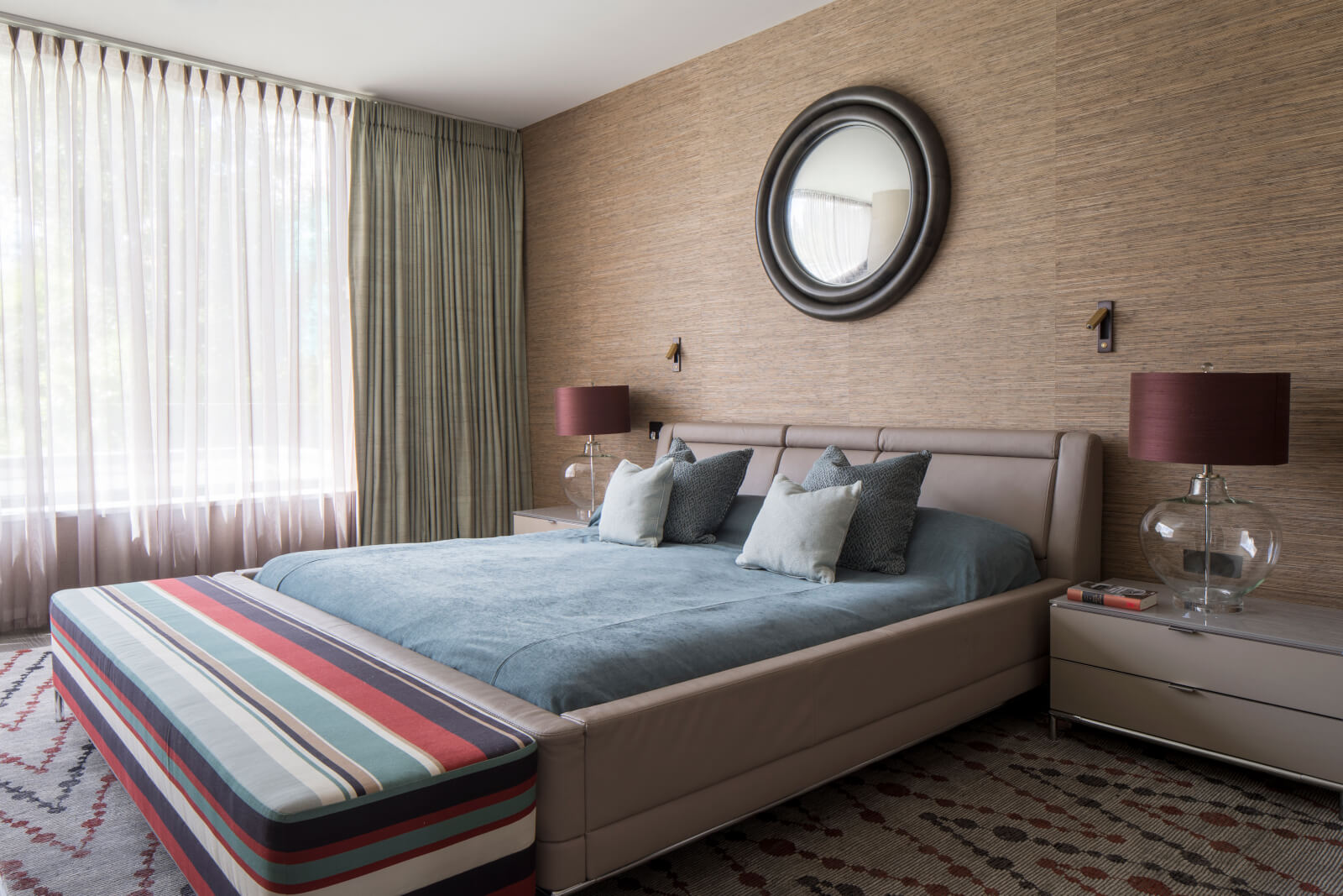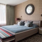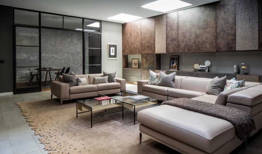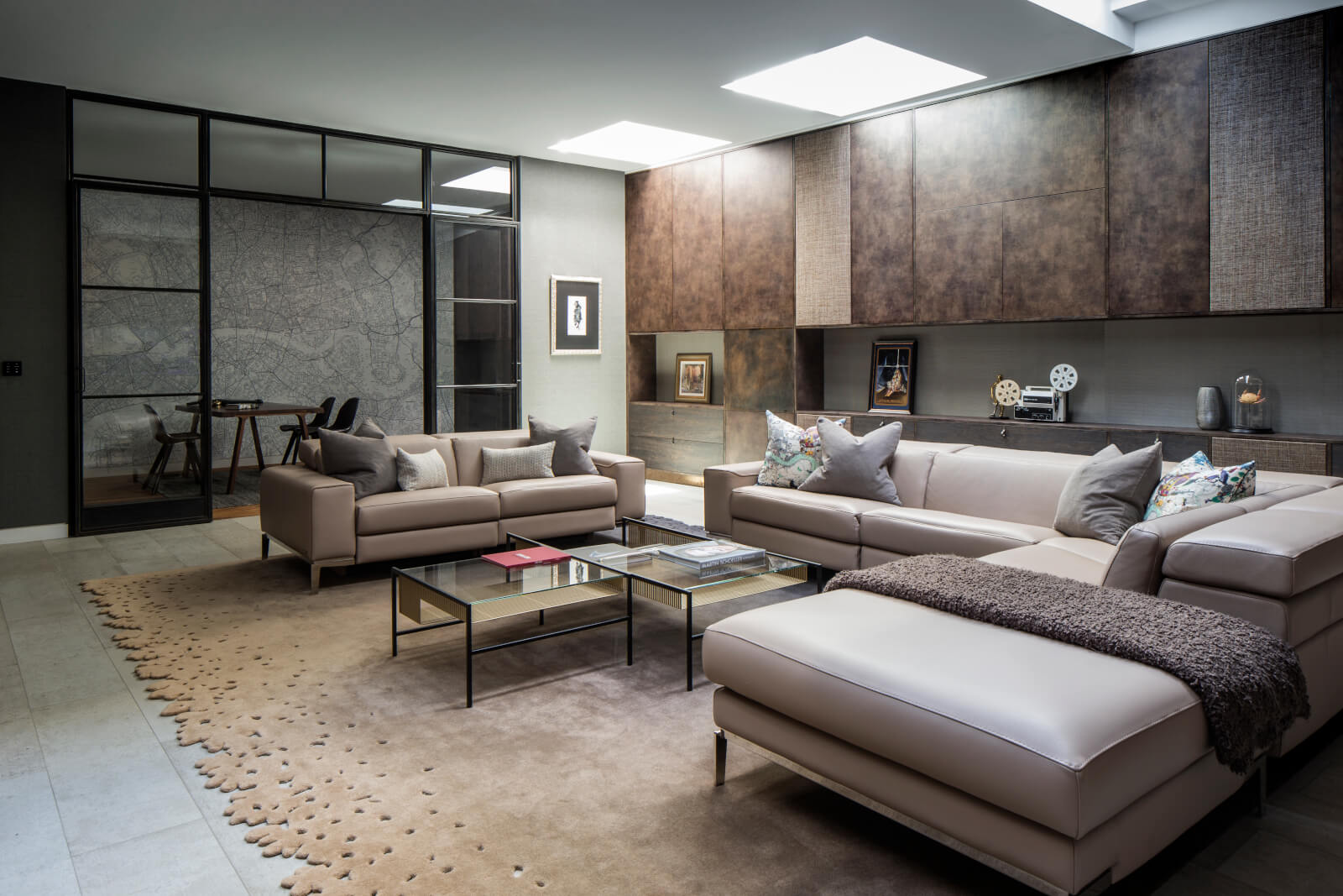 In the library and home cinema, we used beautifully textured rugs to bring together pieces of furniture that our client wanted to include within the design scheme. These rugs form the foundation of the room, while also adding depth and warmth. We also used rugs to brings pops colour and texture to the living room and master bedroom of this comfortable, contemporary family home.