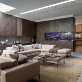 Maintaining the basement as a multi-use space was a key part of the brief and includes a cinema, study, gym and library, as well as a large aquarium brimming with beautiful tropical fish. The space is broken by full height metal glazed doors to isolate the study and the aquarium separates the home cinema from the library.