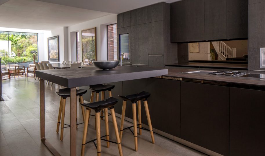 An open-plan living room and kitchen allows for a continuous flow of space and light and a beautiful view into the garden beyond. We incorporated sleek finishes and layers of texture into the kitchen to accentuate the natural harmony between indoors and outdoors.