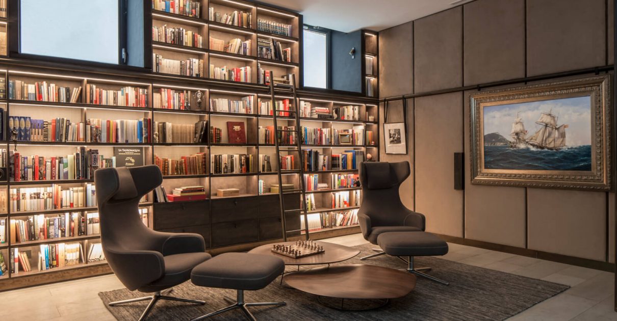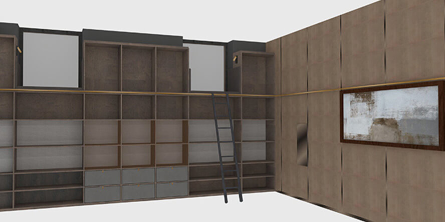 Use the slider to see the original 3D render in contrast to the stunning completed home library.
