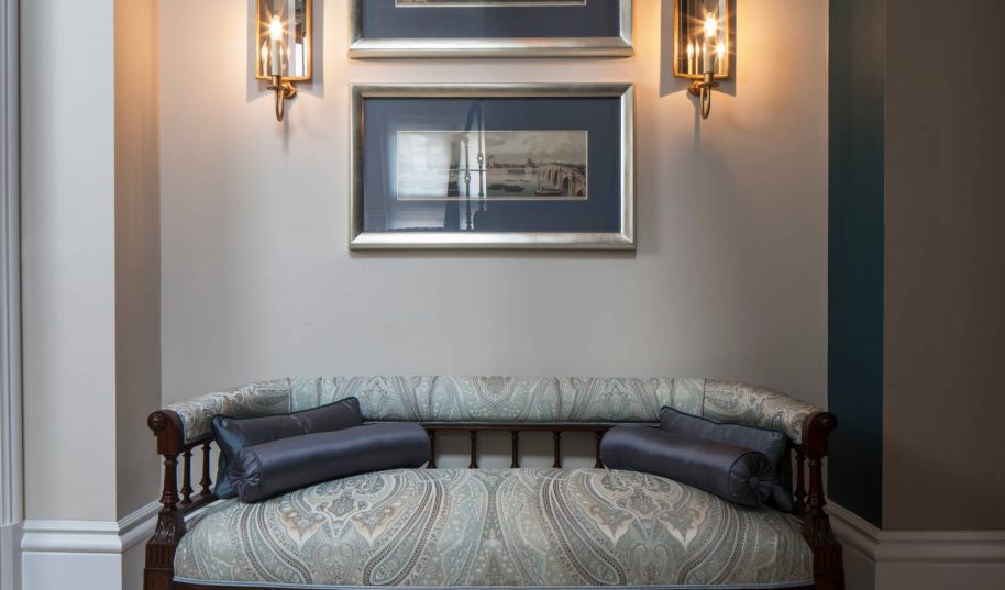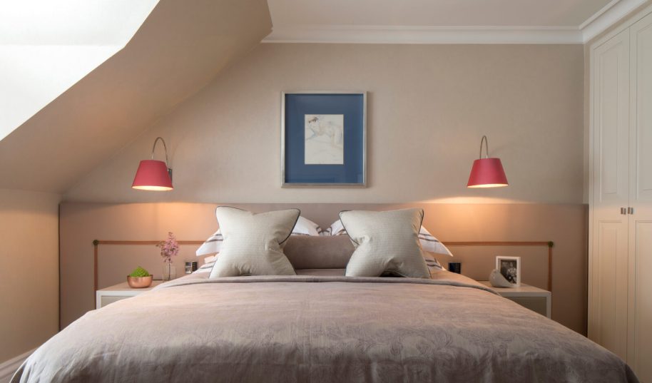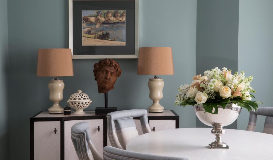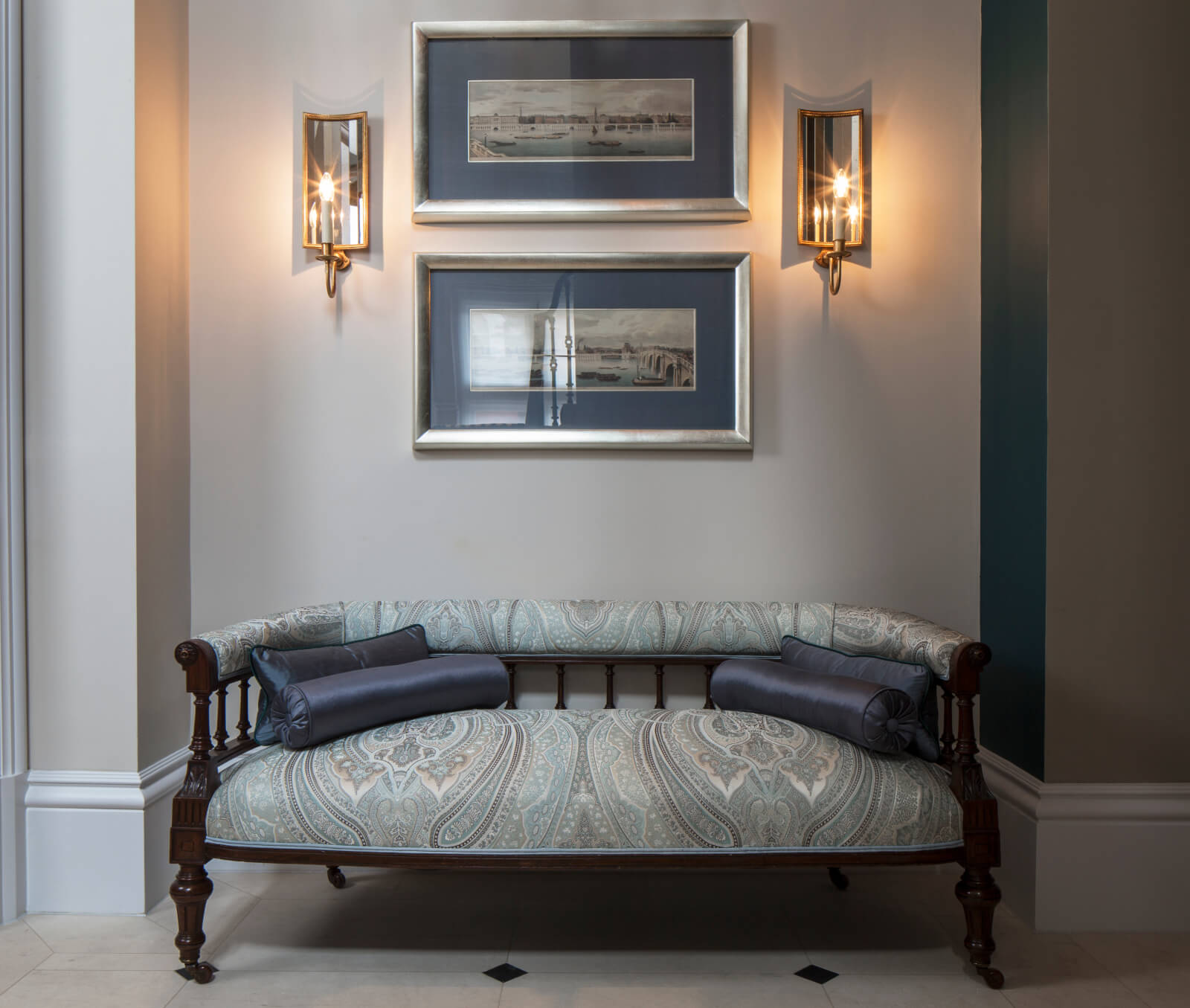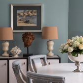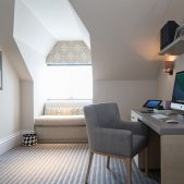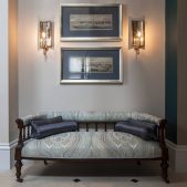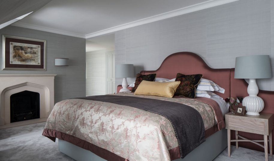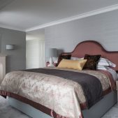 The master bedroom is layered with soft blue silk walls and a silver faux silk carpet. The shaped headboard creates a contrast to the patterned bedspread and charcoal checked throw. Bespoke bedside tables have been designed using bird’s eye maple with fabric-clad drawers, while the walls feature artwork with silk mounts and hand-painted frames. It’s the perfect sanctuary in which to unwind and relax.
