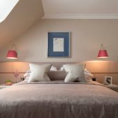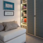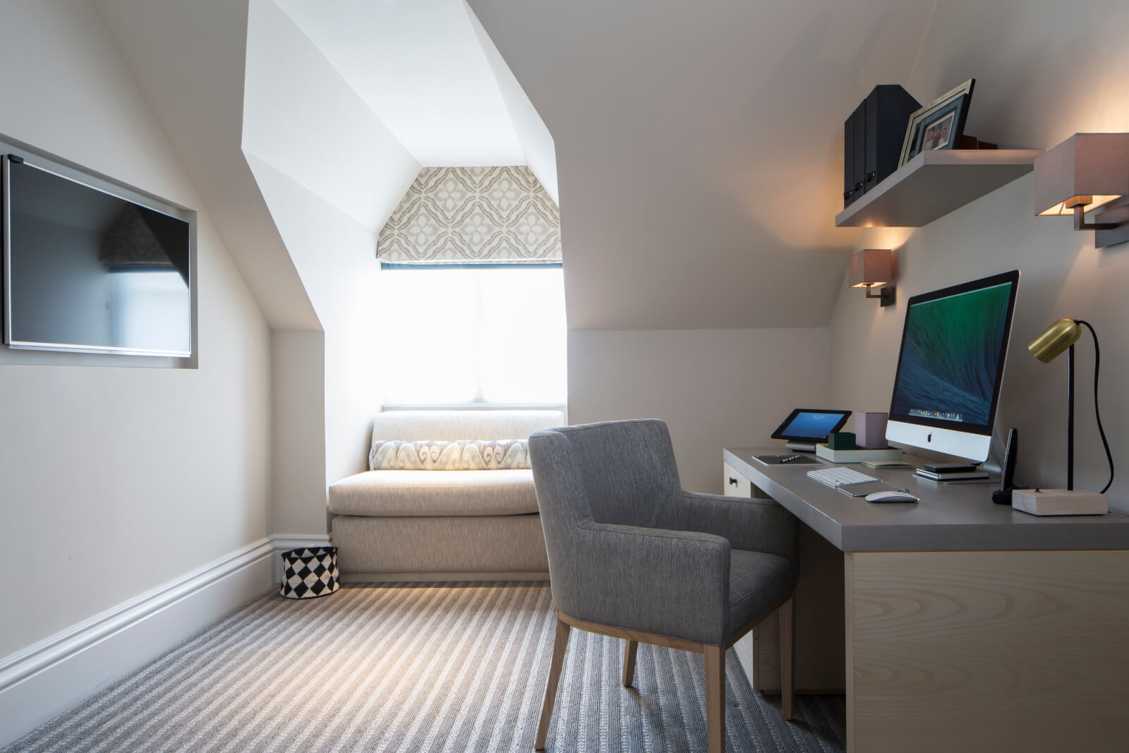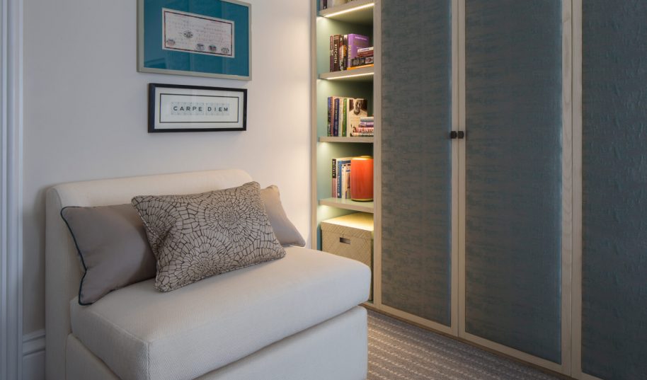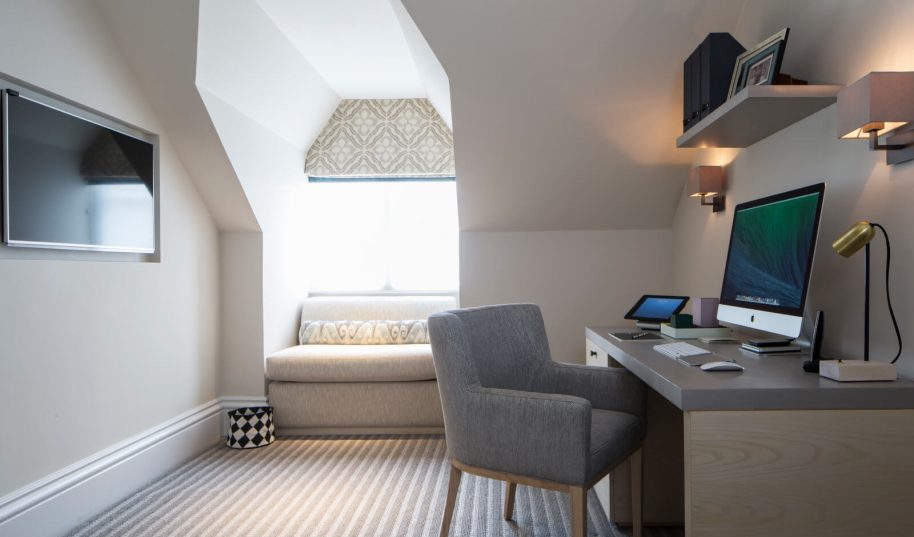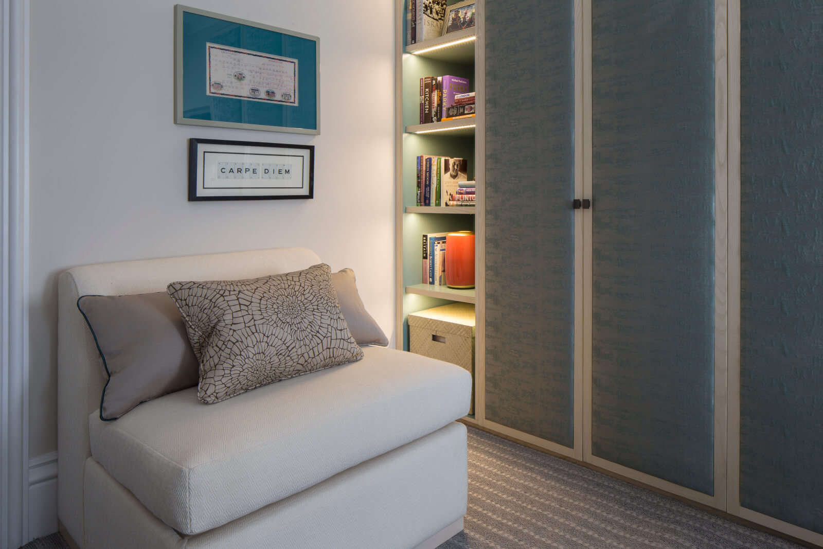 The master bedroom is layered with soft blue silk walls and a silver faux silk carpet. The shaped headboard creates a contrast to the patterned bedspread and charcoal checked throw. Bespoke bedside tables have been designed using bird’s eye maple with fabric-clad drawers, while the walls feature artwork with silk mounts and hand-painted frames. It’s the perfect sanctuary in which to unwind and relax.