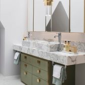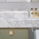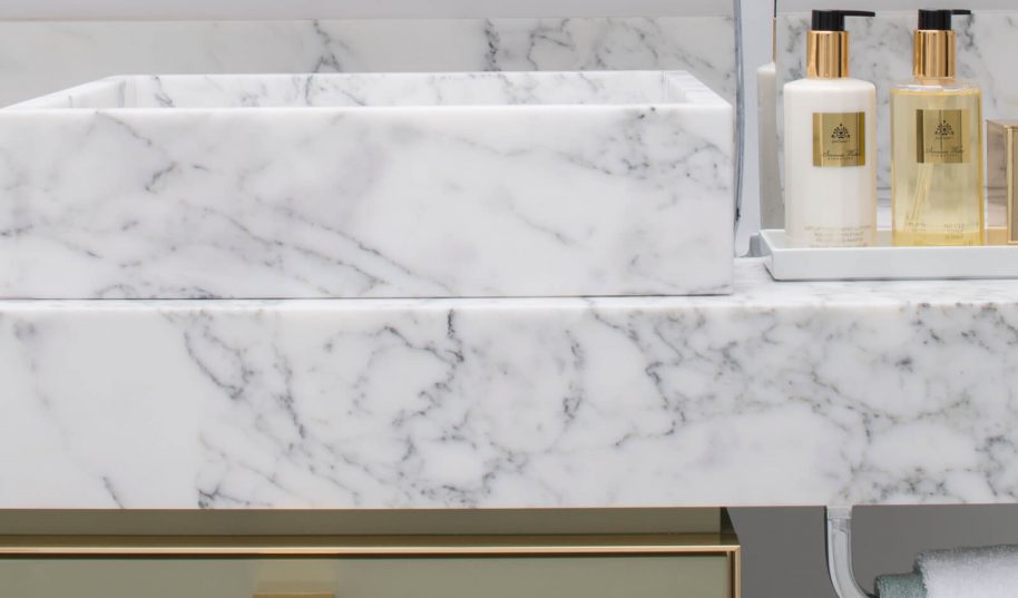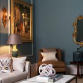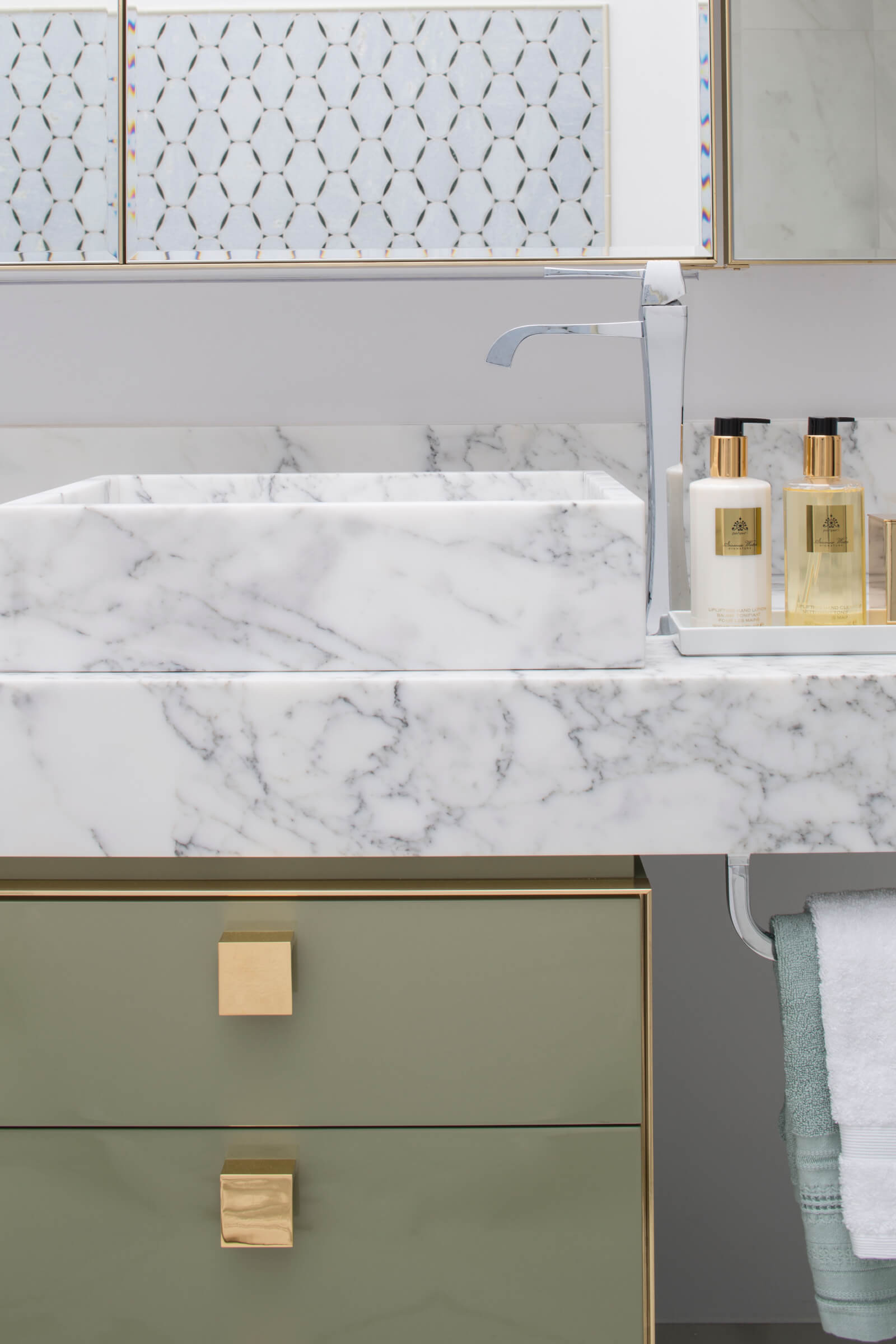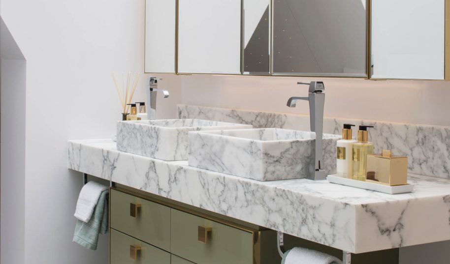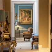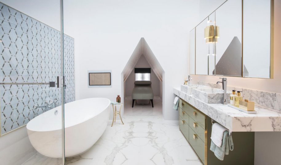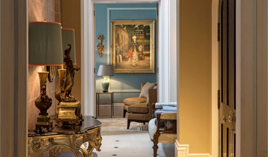 The design is brought together harmoniously by several features connected to the architectural detail of both the interior and exterior of the property. These include the rich colour palette of blues and gold contrasted by light wood to create a sense of glamour. The palette has been carefully chosen to form a backdrop to the use of rich materials like marble, brass and bronze. The layers of light provide an ambient backdrop in each room, which beautifully highlight the materials and finishes to stunning effect.