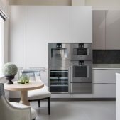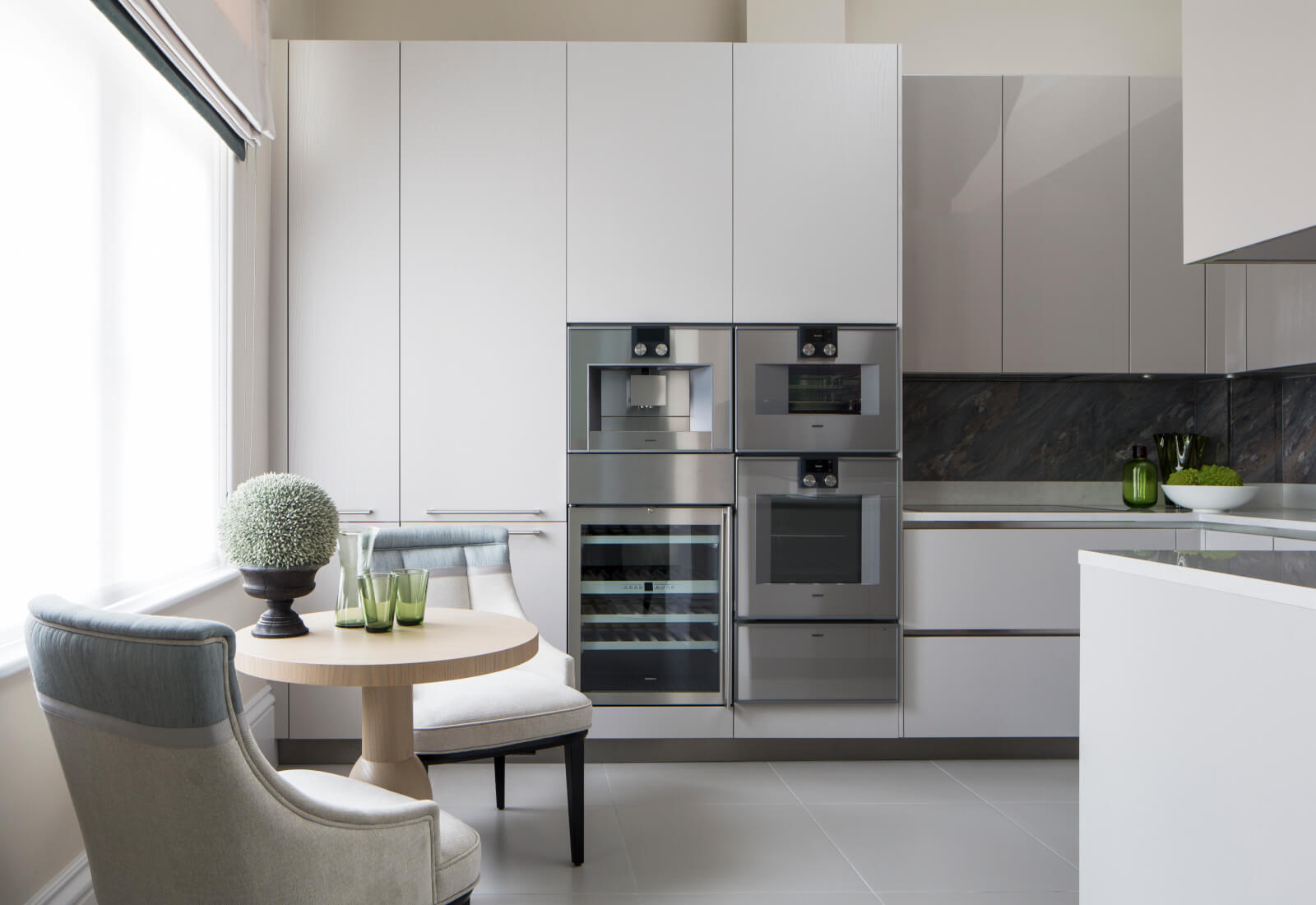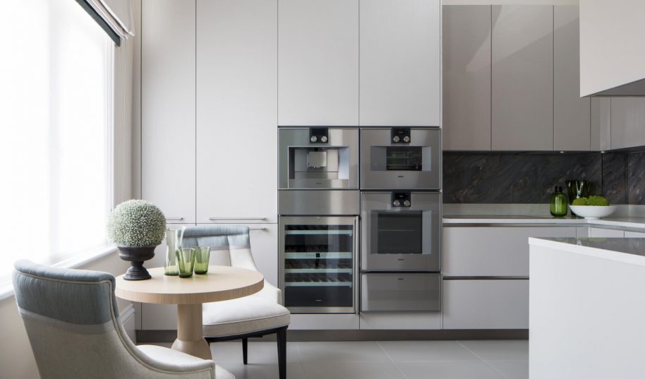 We designed all furniture and soft furnishings as bespoke in a palette of blues and golds, to accentuate a sense of luxury that emanates throughout the space. The design of the reception room is more modest, where light grey armchairs and blue wallpaper are fresh and leisurely. The open plan reception room and dining area feature a large French window that forms a bright flow of space.