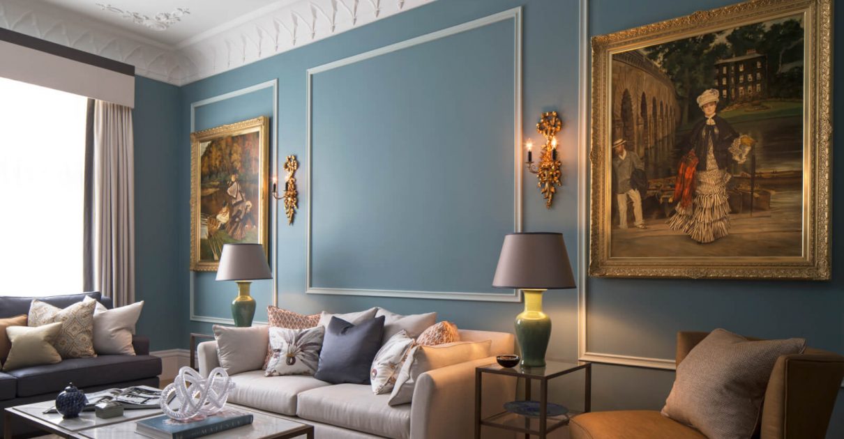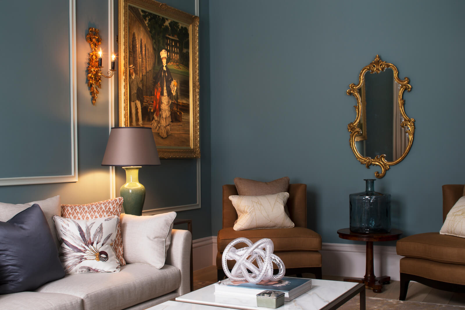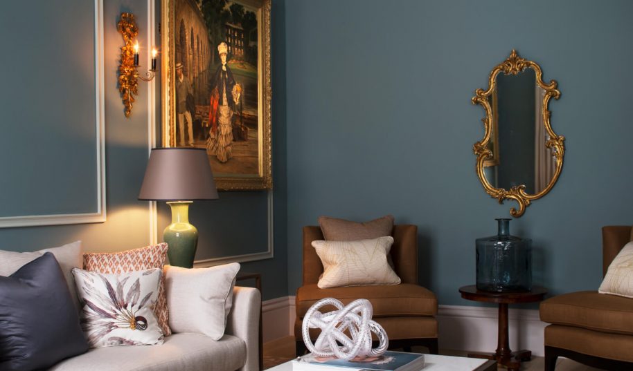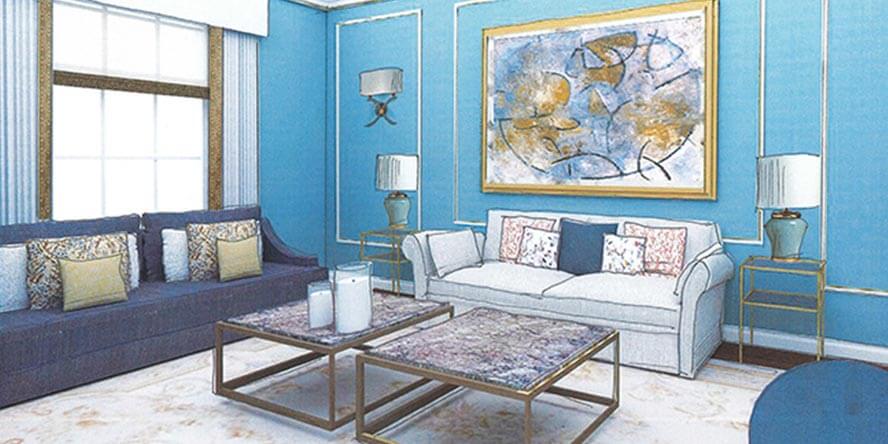 The design of the living room was approached with a sense of grandeur. It is the formal entertaining area as well as a space in which to relax. The silk and mohair patterned, hand-knotted rug forms the foundation of the room and is surrounded by blue-grey walls adorned with elaborately framed commissioned oils.