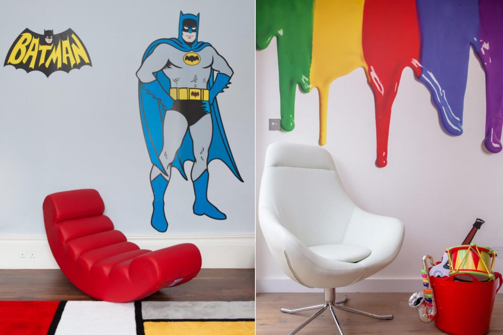 With a playroom design idea in mind, our client wanted to create an area separate from the children’s bedrooms where their two boys could play with their toys and have fun. Working alongside our client’s architect, a blank canvas of white was created, meaning it could be adapted as the children got older. We used an oversized bespoke wallpaper of dripping paint in primary colours, easily applied to any size wall, to add pops of colour without feeling too busy and cluttered.