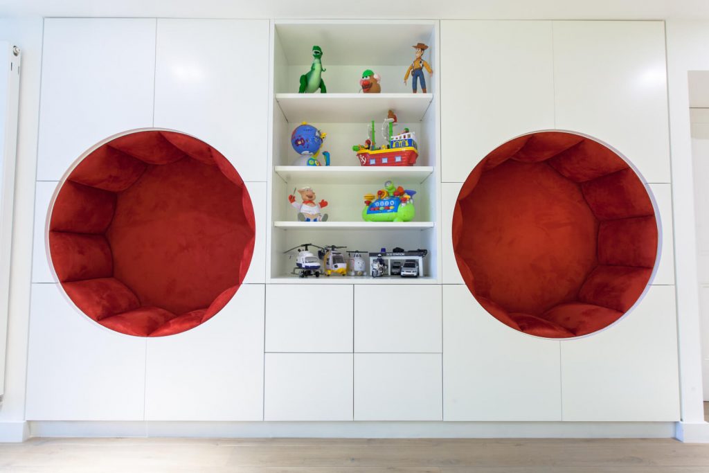 Cleverly, the children’s playroom also boasts built-in white cabinets for keeping the toys neat and tidy whilst unique, upholstered red circles for cosy seating were incorporated to give each child their own special place to sit and read a book or watch TV.