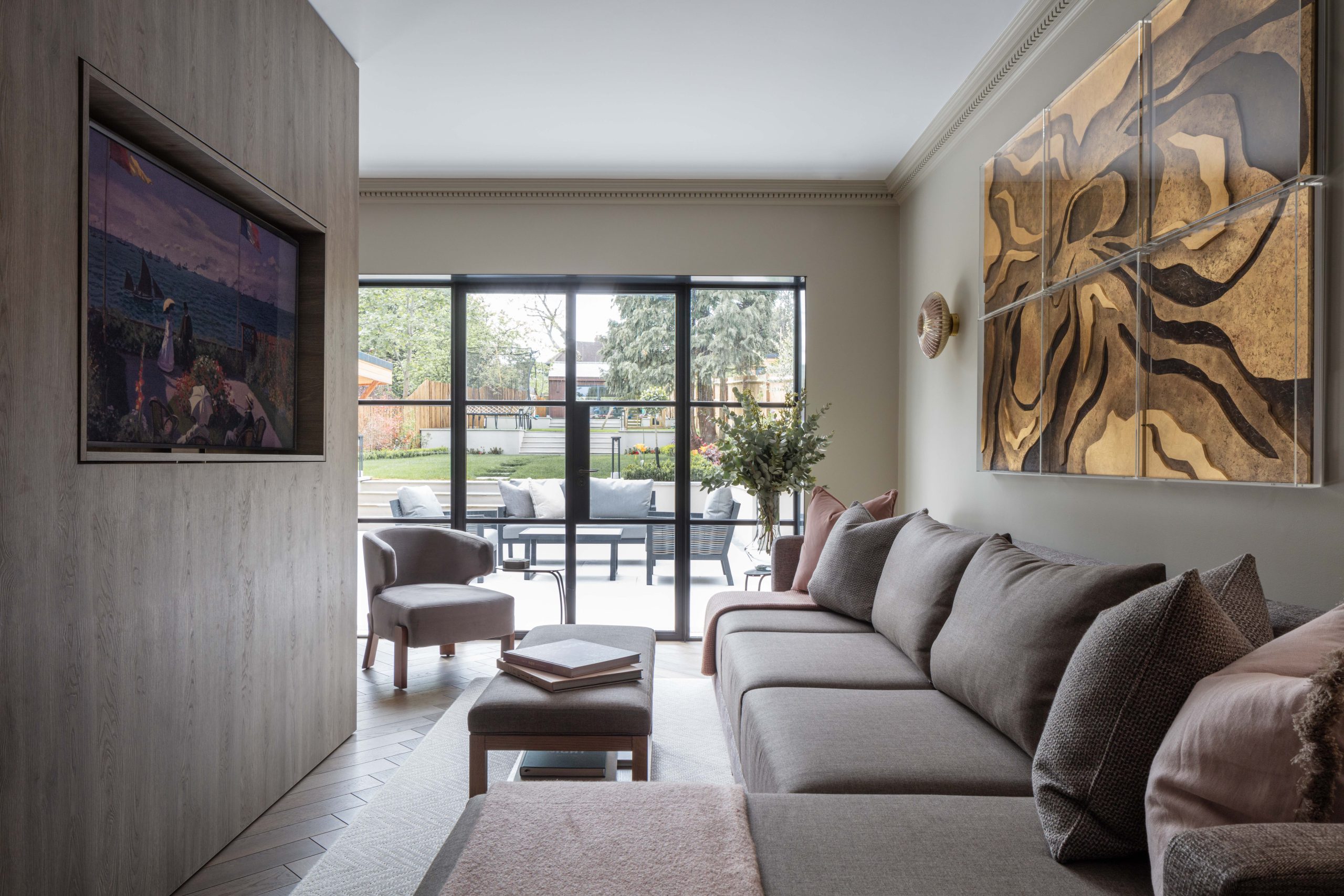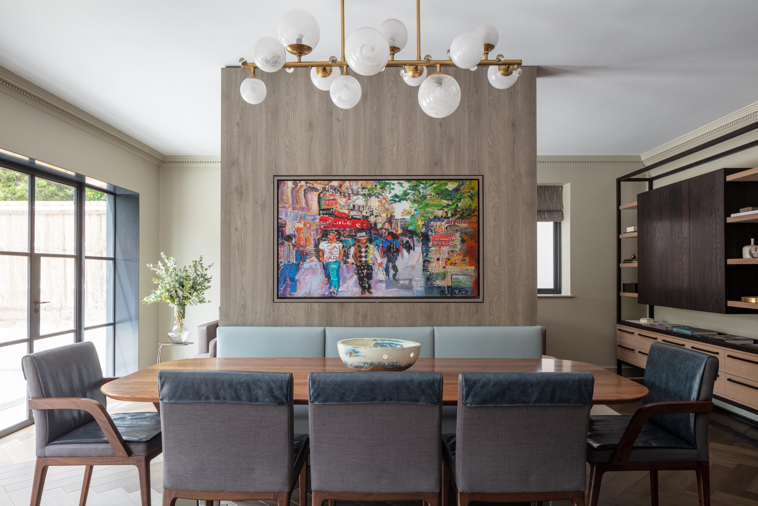 For example, at our North Finchley residential project, we designed a 360-degree revolving panel within the partition. It features a television on one side and an original oil painting of a Parisian street scene on the other, perfectly balancing practicality with elegance.