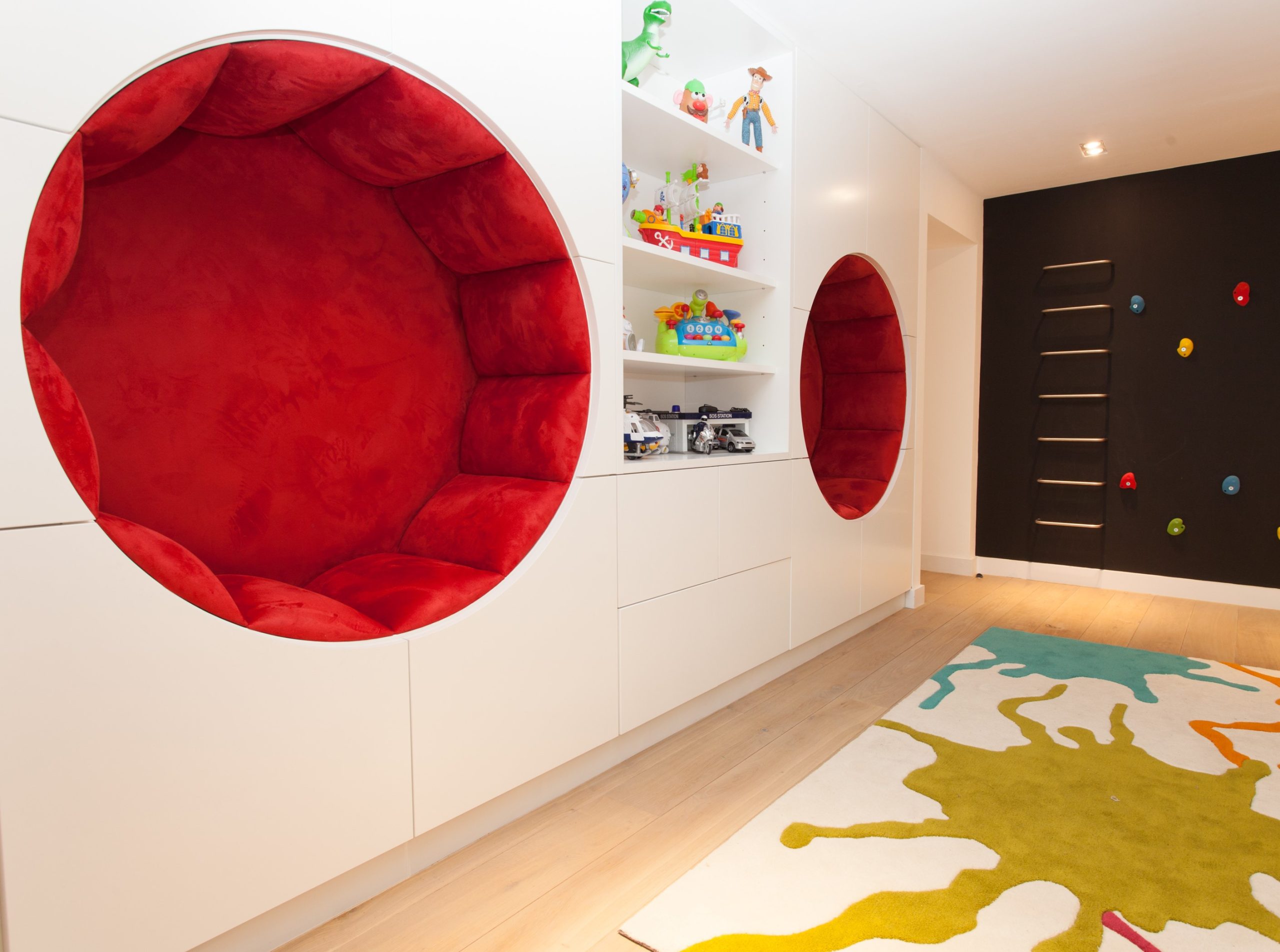 Have fun – The children’s playroom in our Holland Park period property cleverly factors in the British weather with an indoor climbing wall built onto a background of chalkboard paint and recessed circular seating in bright red, ensuring the children can play in this room all year round, come rain or shine.