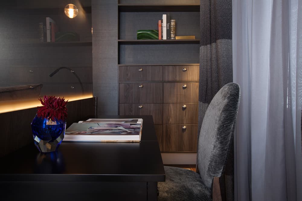 In the bedroom of our Buckingham Street pied-a-terre, a secluded desk area has been separated by a divider that can perform the double function of a headboard or simply a discreet screen that reflects light and creates a warm ambience in the area beyond. LED lighting has been added to the lower edge of the divider to provide a gentle glow, enhancing the intimacy of the space, which is perfect for private reading and relaxing.