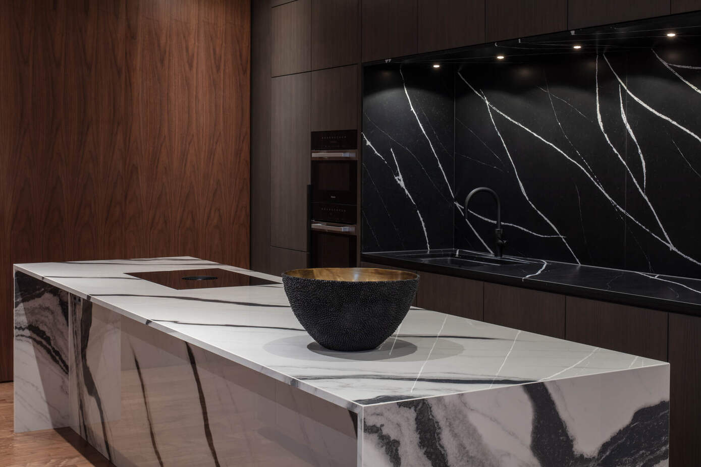 For a showstopping entertainment space at our Ennismore Gardens apartment, we developed a high-contrast reverse monochromatic scheme within the minimalist open-plan kitchen and dining room. A monolithic white and black island with cascading waterfall edges sits before the contrasting black and white Nero Marquina worktop and splashback. Together, this dramatic feature sits perfectly against the rich walnut cladding backdrop to create a sophisticated space perfect for entertaining.