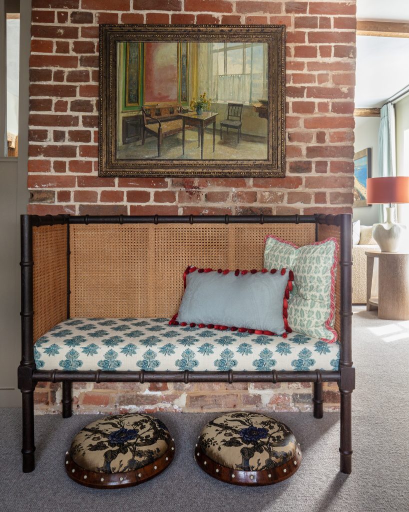 Instead of buying new furniture you could upcycle and repurpose what you already have to fit your new interior. At our Suffolk Hill residential project, we reupholstered a bespoke Japanese-style bench which became one of our favourite elements in the house. The bamboo style complimented the scheme perfectly, and the rattan gave a nod to opting for sustainable materials over mass-produced alternatives. Once paired with the antique Japanese silk footstools it created a perfect little pocket of space.